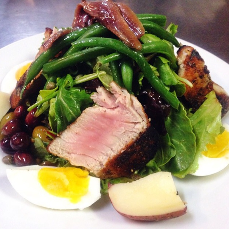 Pan seared tuna with haricot vert, black olives, potatoes, boiled eggs and anchovies